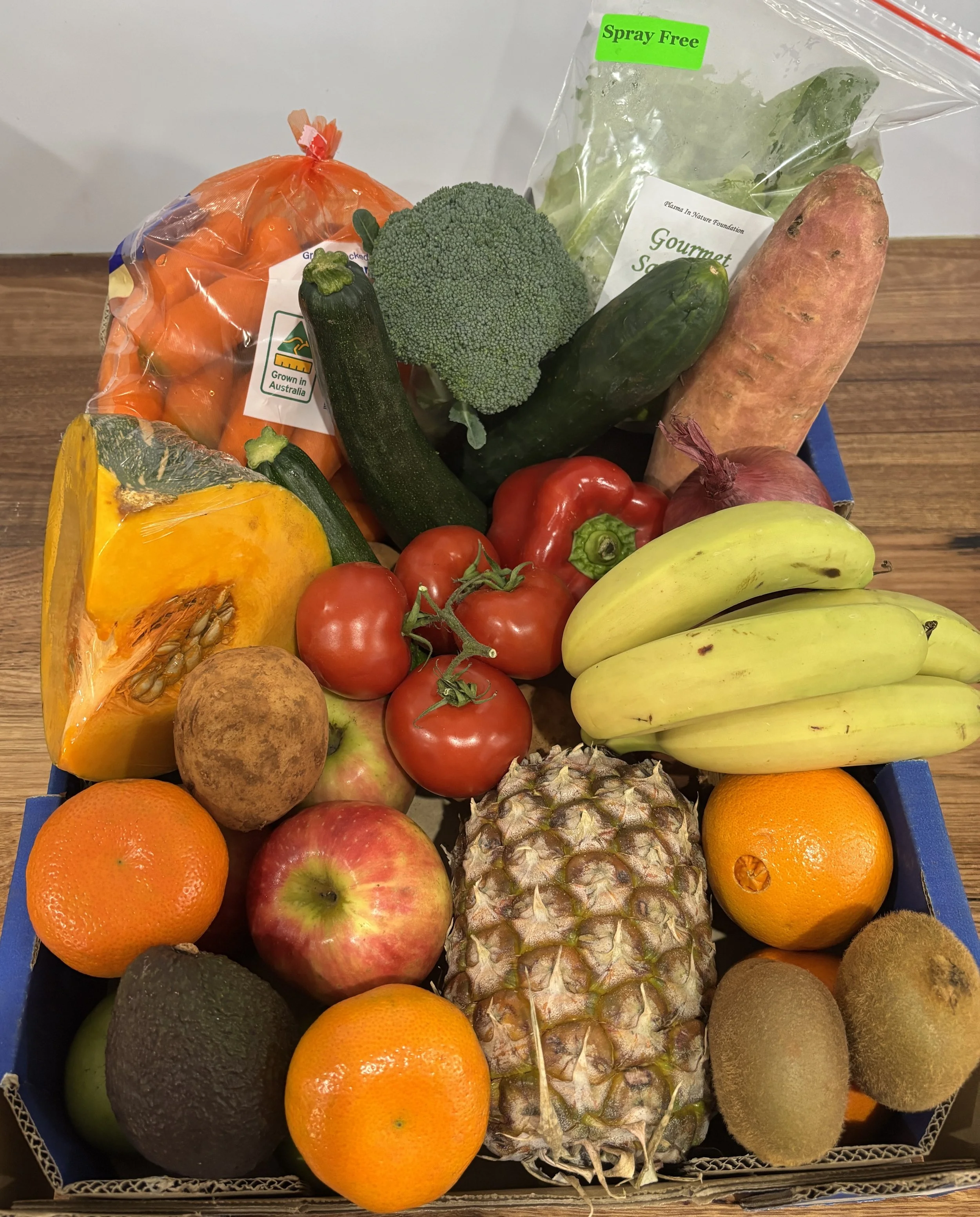 Local where possible - stables :1kg potatoes, ½ kg of pumpkin, local cucumbers, large sweet potato, avocado, tomatoes, spray free lettuce,1 kg carrots, broccoli bunch, red capsicum, 2 onions, dozen Jack’s eggs 700g, 1kg of apples (red & green), pineapple, ¼ of a watermelon bananas, punnet blueberries and 1kg of stone fruit based on seasonality. -