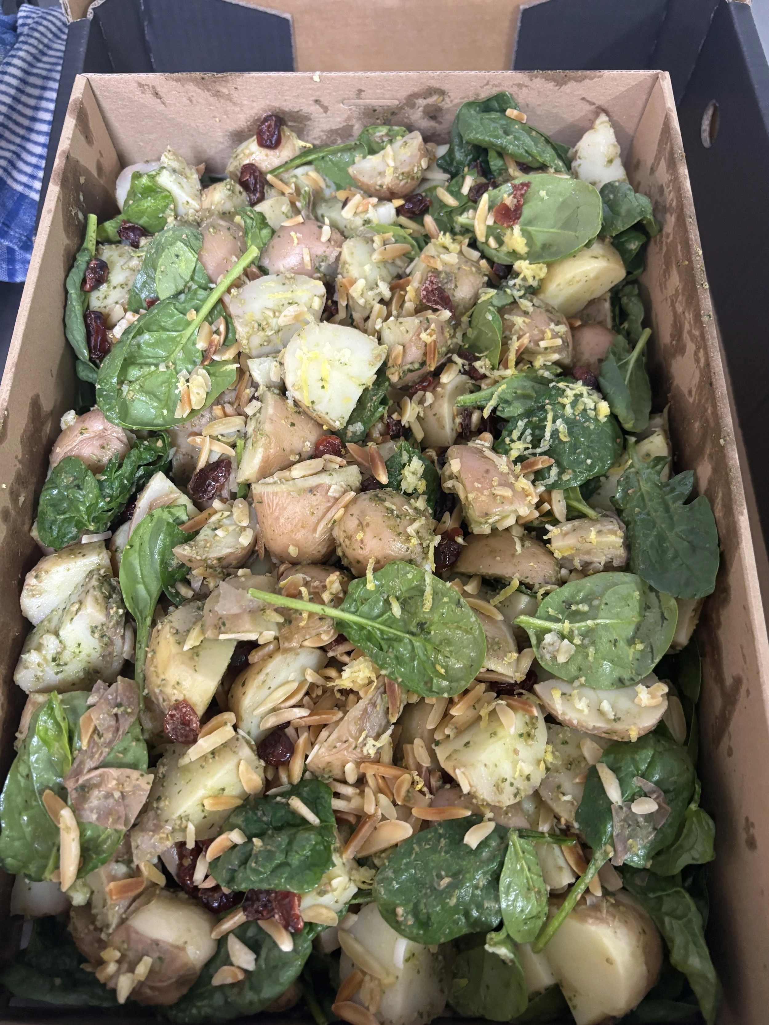 Our cold Christmas potato salad, offers soft chat potatoes generously coated in fresh, house-made pesto. A garnish of toasted slivered almonds adds a refined crunch, creating a balanced family favourite.